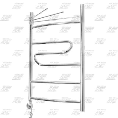 - Полотенцесушитель с минимальными размерами – 400х500 мм. В данном размере он имеет 1 дугообразную, 1 змеевидную перекладины и поворотную полку. Мощность – 110Вт. Обогревает при этом помещение площадью до 2 м².